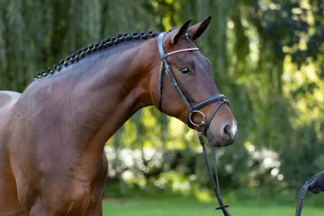 Dunkelbrauner Wallach - *03.04.2020Stockmaß: 168 cmAusbildungsstand: geritten, Dr.Pf.A NiveauGroßrahmig, mit harmonischen Körper und guter Oberlinie steht unser Nachtgold da. Er ist korrekt im Fundament und besitzt drei sehr gute Grundgangarten. Besonders der Schritt ist sehr raumgreifend und fleißig, sein Trab taktmäßig und locker und der Galopp ausbalanciert und gut durchgesprungen. Er kommt sehr gut mit seinem Körper zurecht und zeigt das auch beim Freispringen. Dort punktet er mit Geschick und Lerneifer. Nachtgold ist neugierig, freundlich und hat ein ruhiges Wesen.Sein Vater, der Viertelblüter In Versuchung ist im Dressursport in Frankreich. Seine Mutter Nachschwalbe von E.H. TAMBOUR trägt aufgrund ihrer qualitätsvollen Nachzucht den Titel Elitestute des Trakehner Verbandes. Ihre Töchter Nachtruhe, Nachtamsel, Nachtlerche und Nachteule sind Prämienstuten.