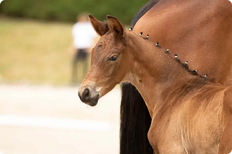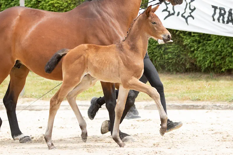 •*23.05.2022•Farbe: Braun•Stockmaß: 161 cm (Februar 2024)•Prämienfohlen der Fohlenschau 2022 in Elmarshausen.Typvoll und edel, mit harmonischer Oberlinie und guter Dreiteilung, bei korrektem Fundament, das ist unser Nachtsperling. Der INTERCONTI-Sohn bewegt sich auffallend elastisch und schwungvoll. Er verfügt über einen äußerst ergiebigen Schritt, der Trab ist raumgreifend aus der gut abfußenden Hinterhand entwickelt, sein Galopp locker und bergauf. Nachtsperling hat ein freundliches Wesen und besitzt eine natürliche Neugier, womit er die Menschen für sich einnimmt. Die Qualität dieser Anpaarung stellten bereits die Prämienstuten Nachtamsel und Nachtlerche unter Beweis. Der Vollbruder Nachfalter ist im Dressursport erfolgreich.